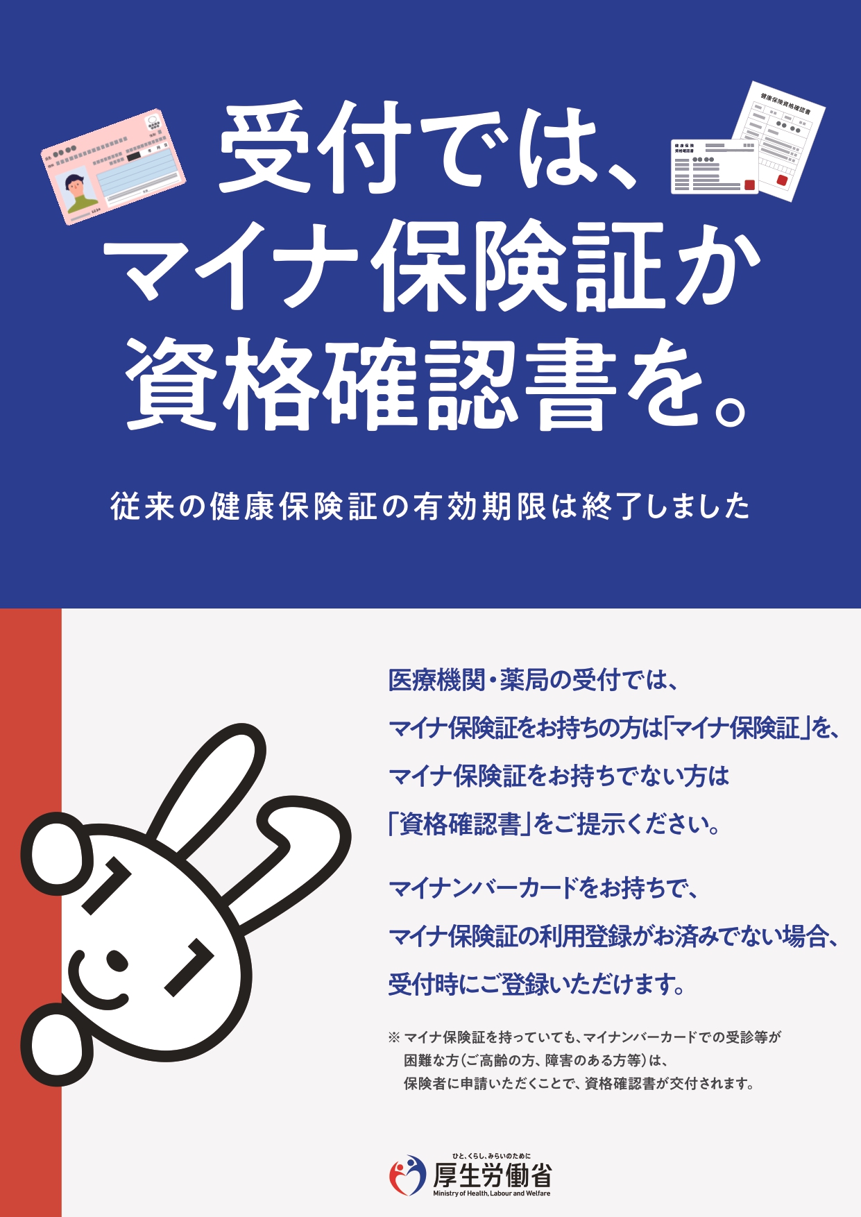 ※令和7年12月1日をもって従来型の健康保険証は有効期限が満了となります。暫定的な措置として令和8年3月末まではご利用いただけますが、ご受診の際にはマイナ保険証又はスマホのマイナ保険証又は資格確認書をご持参くださいますようお願い申し上げます。【資格情報のお知らせ】のみではご受診いただけませんのでご注意ください。